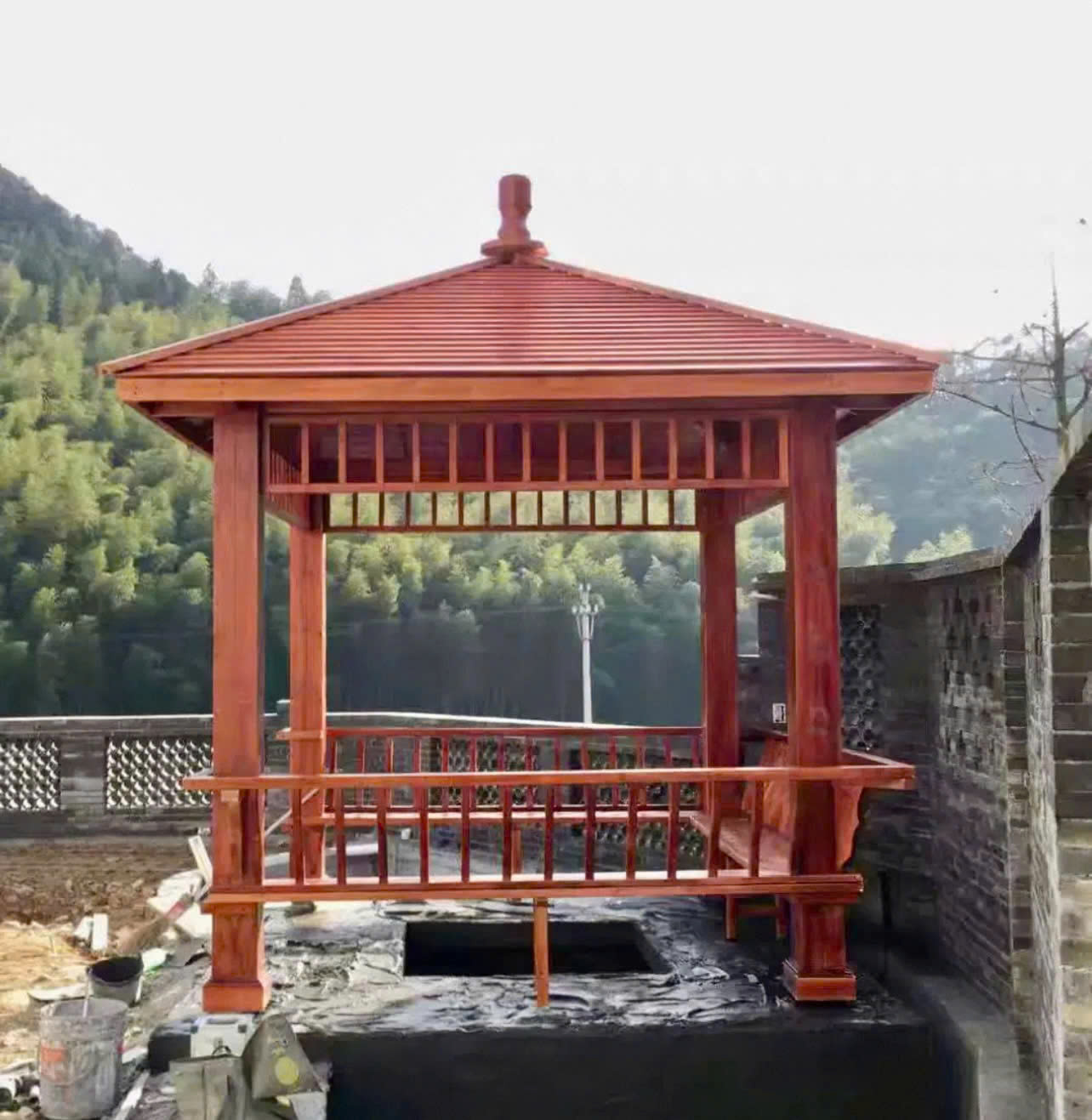 Ngoài ra, để không gian thêm phần tiện nghi, bạn có thể bố trí thêm các bộ bàn ghế ngoài trời bằng gỗ nhựa đồng điệu hoặc các mẫu ghế công viên bền bỉ xung quanh khu vực chòi để tạo thành một tổ hợp thư giãn đa năng.